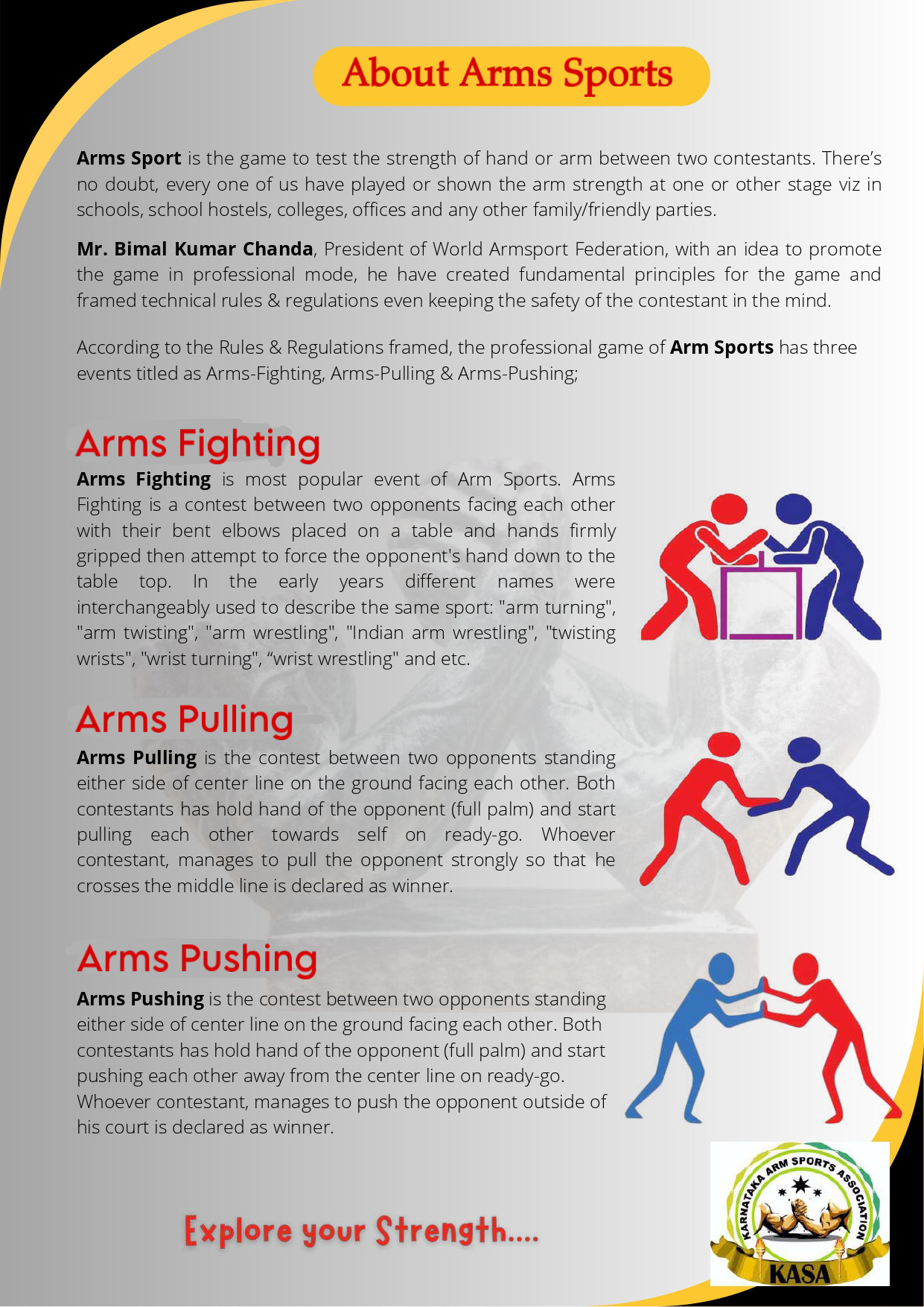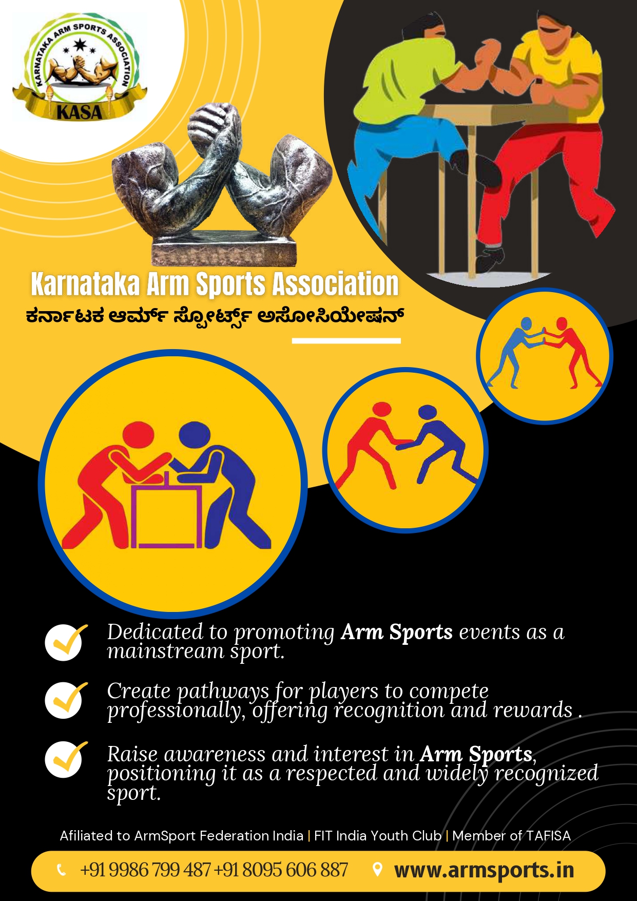 Karnataka Arm Sports Association – KASA is formed under the guidance of Mr. Bimal Kumar Chanda, an international Arm Sports player, with the idea to promote the game of Arm Sporting in a professional way and create career opportunities among the youth of Karnataka.