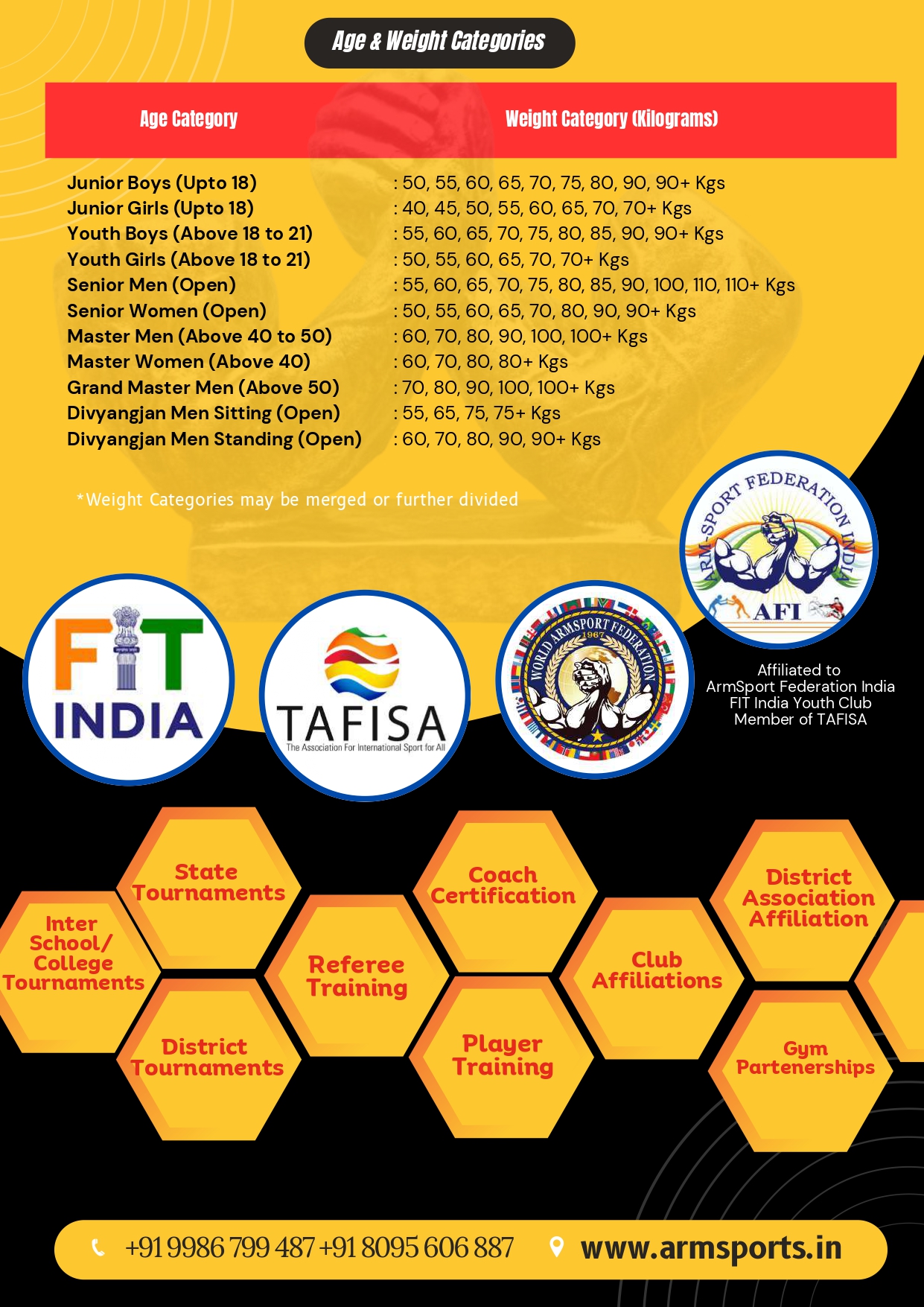 Arm sports tournaments may also be divided along weight classes as well as left and right-handed divisions.